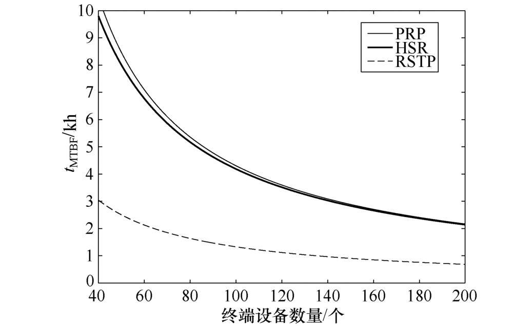 从图10可知, 随着列车终端设备数量的增加, 3种冗余协议的可靠度均呈下降趋势, 但其平均故障间隔时间始终保持PRP> HSR> RSTP的特点.