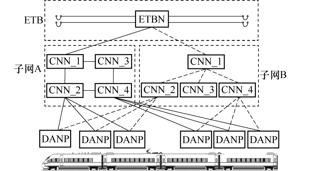 采用PRP冗余的TCN架构如图2所示, ETB采用双链路热备传输提供冗余.ETBN同时与ECN的两个子网连接, 子网采用不同的拓扑形式, 且角色平等, 没有主辅之分.本文为体现这一特点, 子网A设计为环网拓扑, 子网B设计为树形拓扑.网络终端设备为双连接节点(Double Attached Node implementing PRP, DANP), 有两个端口, 支持PRP协议, 直接与两个子网连接, 实现冗余通信.图2中相同标号的CNN代表CNN冗余对.如1号车厢的DANP通过两条冗余链路(图中实线与虚线)分别连接在互为冗余的两台节点交换机CNN_1上, 图2中8台CNN组成4组CNN冗余对, 为4节车厢(或组网)提供网络冗余.