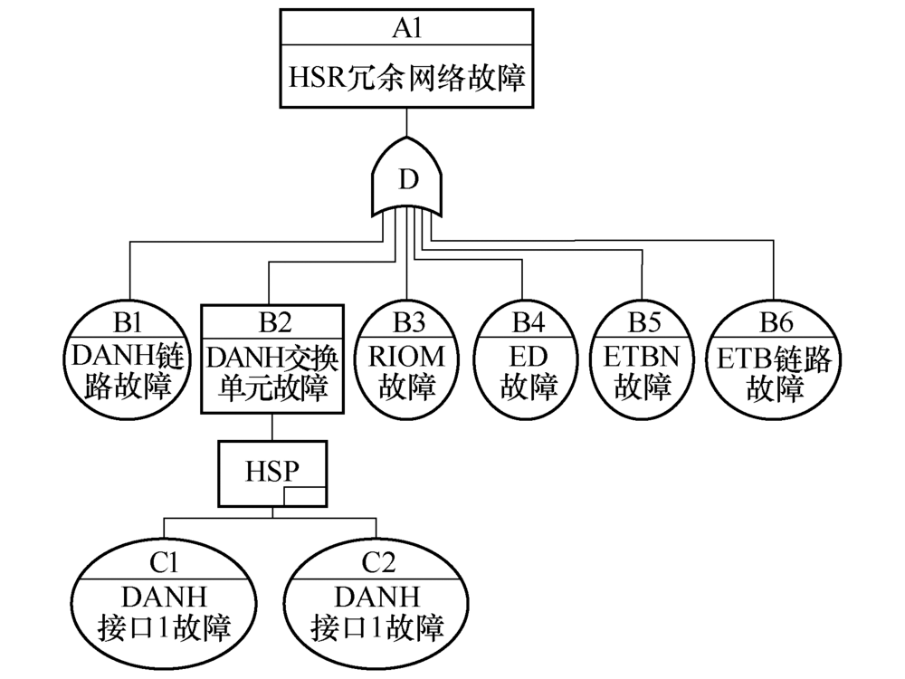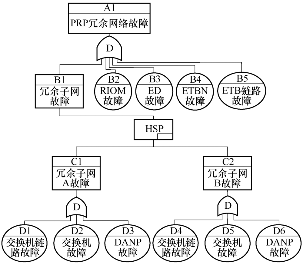 为了使故障分析更简明, 本文将列车通信网络的功能性设备归纳两类, 分别是远程输入输出模块(Remote IO Module, RIOM)和ED, 所有影响网络运行并会造成网络故障的事件均作为DFTA的底事件.使用动态逻辑门描述各子系统的交互部分故障.图5至图7中HSP表示热备件门, 其在备用状态的故障率与工作状态下故障率相同.D表示动态或门, 当底事件输入至少有一项发生时, 门的输出事件发生.圆形图标代表故障树底事件, 方形图标代表中间事件或顶事件.