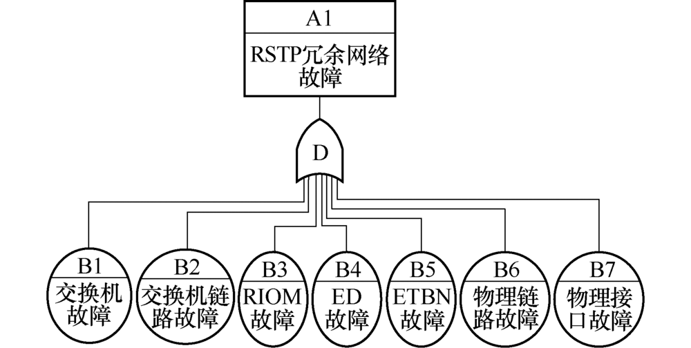 RSTP网络冗余结构如图1所示, 动态故障树模型及故障底事件如图7所示, 冗余网络中共需交换机4个, ETBN 1个, 交换机链路故障率为单一链路失效率, ETBN链路双线冗余故障率约为0.将网络元件失效率参数代入式(3)进行静态故障树迭代计算, 求得RSTP冗余的TCN网络失效率为