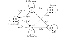 由图5和图6可知, 本文提出的基于PRP和HSR的列车通信网络动态故障树模型有7~10个底事件, 若直接转化为Markov过程, 状态个数巨大, 且随着网络设备的增加和网络的演进, 该维数会越来越高, 直接进行迭代计算时, 会严重消耗计算设备内存与计算时间, 多次的有效数字约减会增大计算误差, 降低准确度与效率[13, 14].本文对图5与图6中的动态逻辑门单元进行Markov动态子树求解, 得出动态可靠性指标后, 用其参与整个故障树的BDD静态子树计算, 得出整个冗余网络的可靠性指标.