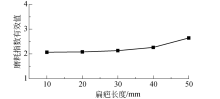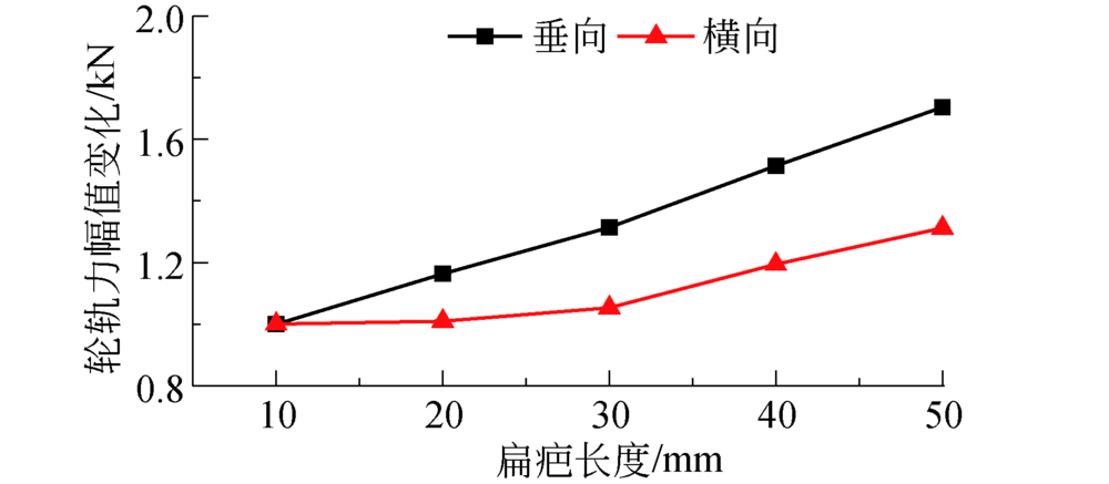 由图10还可以看出, 车轮扁疤越长, 轮轨垂向接触力峰值越大, 进一步分析扁疤长度对轮轨力的影响.分别将不同车轮扁疤长度对应的轮轨力峰值除以10 mm扁疤时的轮轨力峰值, 得到轮轨垂向接触力和轮轨横向力增长指数.如图11所示, 车轮扁疤越长, 轮轨力峰值越大; 50 mm扁疤对应的轮轨垂向接触力峰值增长倍数为1.7, 轮轨横向力峰值增长倍数为1.3.由此可见, 轮轨垂向接触力峰值变化幅度大于轮轨横向力峰值变化幅度.