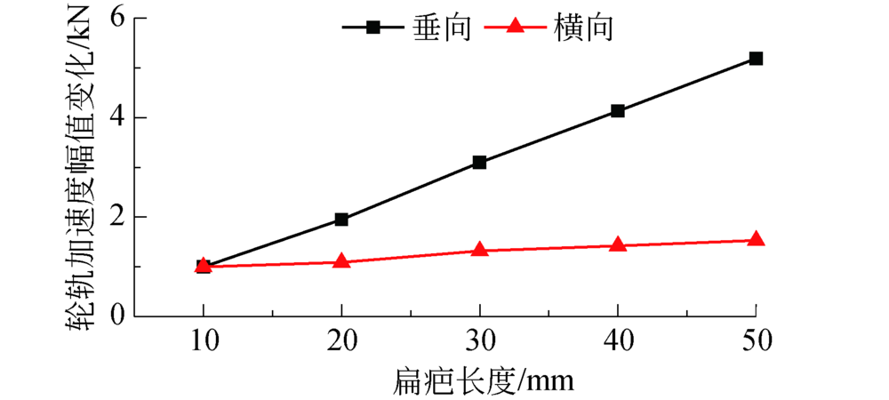 采用相同的方法分析扁疤长度对轮对轴箱位置(车轮出现扁疤一侧)振动加速度的影响.如图13所示, 车轮扁疤越长, 加速度幅值越大, 50 mm扁疤长度对应的垂向加速度幅值增长倍数为5.1, 横向加速度幅值增长倍数为1.5, 垂向加速度幅值变化幅度明显大于横向加速度幅值变化幅度.