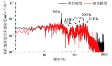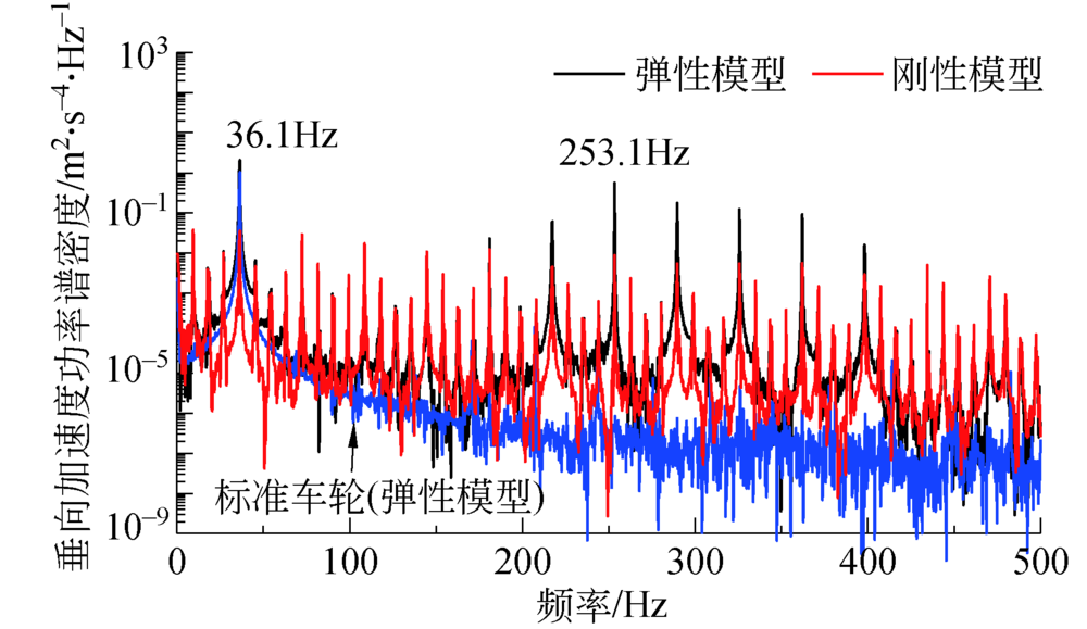 弹性化处理后, 轮对垂向振动加速度频谱存在与轮对旋转频率相关的频率特征[3]; 而考虑为刚性模型时, 轮对垂向振动加速度频谱不存在与轮对旋转频率相关的频率特征.图8给出了武广线路激扰下, 分别考虑为弹性和刚性时, 轮对垂向加速度振动频率分布.列车运行速度350 km/h, 只有弹性化处理后的轮对垂向加速度频谱出现36 Hz的旋转频率特征, 这与实际线路测试结果[3]一致.此外, 在70~300 Hz频率范围内(125 Hz、152 Hz、200 Hz和241 Hz), 2种模型轮对垂向振动加速度均存在频率尖峰, 这些频率特征有可能由轨道短波不平顺激起, 极有可能激起轮对在70~300 Hz频率范围内丰富的弹性模态, 弹性模型轮对垂向振动能量大于刚性模型振动能量.故此, 高速轮轨动力学研究中, 需将轮对做弹性化处理才能体现出轮对的旋转振动特性, 且弹性振动会提高轮对中高频垂向振动能量.