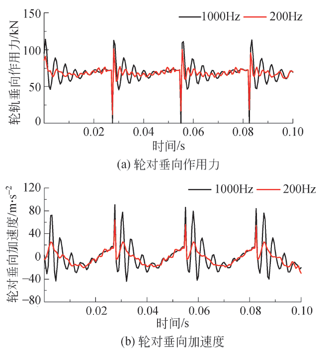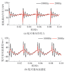 为了确认200~400 Hz范围内, 车轮扁疤伤损所激起的轮对弹性振动对轮轨垂向作用的影响程度, 将轮对模态截止频率设置为200 Hz, 对比不同模态截止频率下, 轮轨垂向作用力和垂向振动加速度幅值的差异.如图15所示, 设置截止频率为200 Hz后, 轮轨垂向作用力最大值由113 kN减为101 kN, 减小了11%, 轮轨垂向作用力峰值衰减时间由0.018 s减为0.01 s; 轮对垂向振动加速度幅值由67 m· s-2减小到47 m· s-2, 减小了30%, 轮对垂向加速度峰值衰减速度加快.因此, 当不考虑轮对200 Hz以上弹性模态特征后, 轮对自身弹性特征减少, 车轮扁疤伤损所激起的轮轨垂向作用力和轮对垂向振动加速度峰值均有不同程度的减小, 这表明在轮对旋转运动过程中, 车轮扁疤伤损所产生中高频冲击极有可能激起轮对中高频弹性共振, 且该冲击作用对于轮轨垂向动力性能的影响不容忽视.