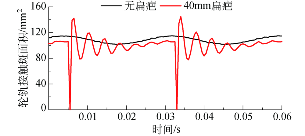 通过分析不同扁疤长度下轮轨垂向接触力变化可知, 在扁疤长度超过30 mm时, 轮轨间会出现短暂轮重完全减载现象, 这说明轮轨可能会出现短暂脱离现象.为了确认这一现象, 需分析车轮出现扁疤伤损时轮轨接触斑面积的变化, 进而判断轮轨接触状态.