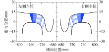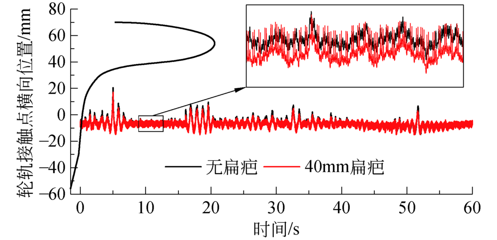 轮轨接触几何关系也能体现轮轨接触状态变化, 故引入轮轨接触点横向位置来分析车轮扁疤伤损对轮轨接触几何关系的影响.图18给出了车辆系统以350 km/h运行在考虑武广激扰线路运行时, 不同车轮状态下轮轨接触点横向位置变化情况.与正常车轮相比, 存在扁疤伤损的车轮轮轨接触点横向位置整体变化规律与之相似, 整体变化趋势更靠近车轮外侧.从局部放大图还可以发现, 车轮扁疤冲击时, 轮轨接触点会突然向轮背一侧移动, 随着车轮旋转运动, 这一现象呈现周期性变化.
