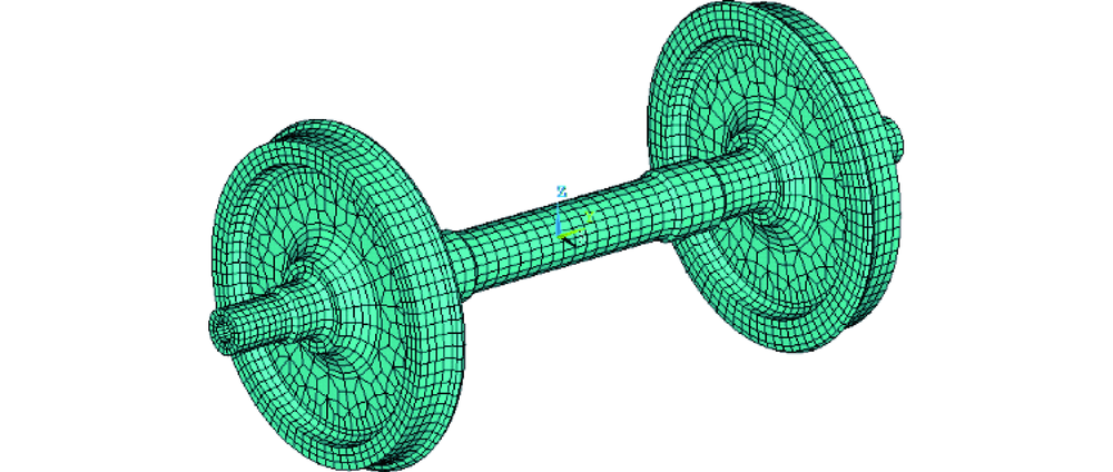 将某型高速列车轮对的实体模型导入有限元软件中进行网格划分, 得到轮对的结构信息文件.由于网格划分的精度直接影响有限元计算的准确性, 综合考虑到计算机计算能力、提高运算速度并保证计算精确性, 轮对车轮采用LMA型踏面外形, 车轴是采用有利于列车轻量化的空心车轴, 如图2所示, 轮对有限元模型的最小网格尺寸为2 mm, 单元数为104 464个, 节点数为124 421个.