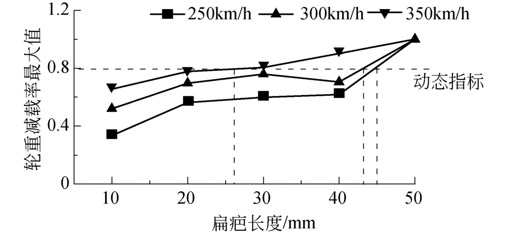 车轮出现扁疤伤损后, 在其旋转运动过程中, 会不断地对轮轨系统产生周期性冲击, 且对轮轨系统垂向冲击最为显著, 垂向冲击引起的轮轨垂向作用力过大或者车轮严重减载均会威胁高速列车行车安全, 需利用轮重减载率和轮轨垂向接触力两项指标对车轮扁疤长度予以限制.我国《高速试验列车动力车强度及动力学性能规范》(95J01— L)规定, 动力车通过直线、曲线、道岔和桥梁时, 导向轮对每个车轮作用于轨道的垂向作用力限值为170 kN[12], 轮重减载率静态标准为0.6, 动态标准为0.8.