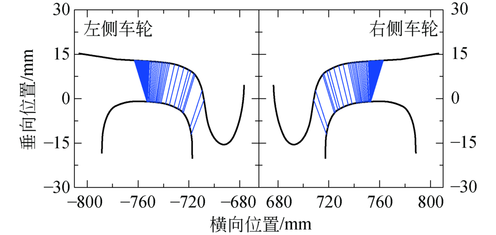 在SIMPACK前处理模块中, 调入经有限元分析后的各部件模态和结构信息文件, 分别生成轮对、构架和车体弹性模型.车轮踏面外形采用LMA型踏面, 钢轨采用CHN60钢轨, 轮轨内侧距为1 353 mm, 轮轨接触几何关系如图4所示.