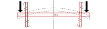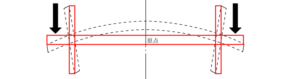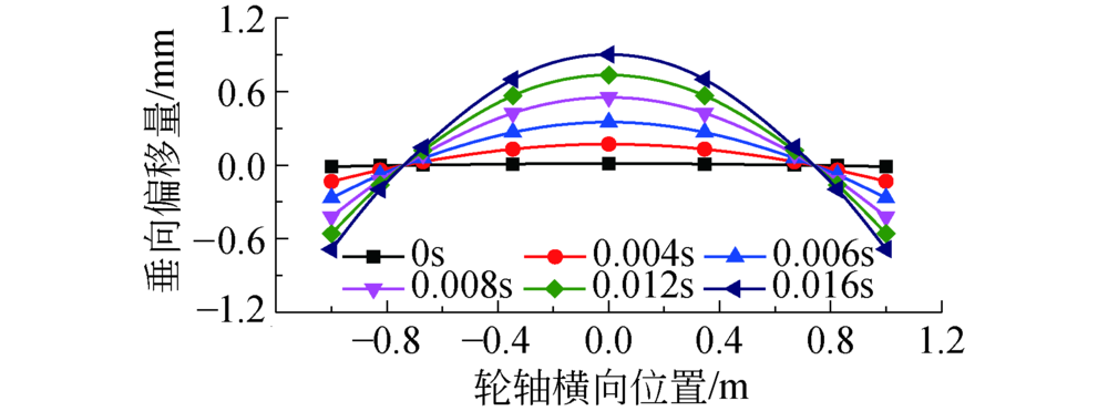 如图6所示, 在实际运用中, 轮轴承受车辆重量后将发生垂向弯曲变形, 车轴中心线不再是直线, 车轮向外侧偏转.弹性车辆系统模型能够体现轮轴变形特征, 这里以车轴未发生弹性变形时的轮对质心位置为原点, 获得了车轴中心线上不同截面(0, ± 0.35 m, ± 0.67 m, ± 0.82 m, ± 1 m)的垂向偏移量.图7给出了不同时刻轮轴垂向弯曲变形特征, 在轮对旋转运动过程中, 轮轴垂向弯曲变形以及车轮向外偏转程度会随之变化.