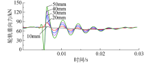 图10给出不同车轮扁疤长度下轮轨垂向接触力变化.在车轮扁疤冲击作用下, 轮轨垂向接触力会先减小后增大, 最大可到达正常轮载的2倍.当车轮扁疤长度超过30 mm时, 轮轨垂向接触力会减小到零, 即出现短暂轮重完全减载现象.