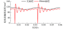 图16给出了正常车轮和出现40 mm扁疤伤损两种条件下轮轨接触斑面积的周期性变化.车轮扁疤与钢轨发生冲击时, 轮轨接触斑面积会减小到零, 而后急速增大到142 mm2左右.这表明当车轮出现40 mm扁疤伤损时, 轮轨间会出现瞬间脱离现象, 所以轮轨垂向接触力会减小为零, 出现短暂轮重完全减载现象.