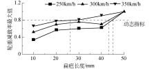 综上所述, 当列车运行速度在300 km/h及以下时, 车轮扁疤长度需限制在30 mm; 当列车运行速度达到350 km/h时, 车轮扁疤长度需限定在25 mm.
