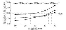 图20和图21分别给出了车辆系统分别以250 km/h、300 km/h和350 km/h 3个速度等级在考虑武广激扰线路运行时, 不同扁疤长度下, 轮重减载率和轮轨垂向接触力最大值变化.车辆系统运行速度越高, 轮轨间垂向相互作用更加激烈, 轮重减载率和轮轨垂向作用力均会越大, 且轮重减载率和轮轨垂向作用力均随车轮扁疤长度增大而增大.以轮重减载率动态标准0.8为安全限值, 列车运行速度为350 km/h时, 须将车轮扁疤限制在25 mm以内; 列车运行速度为300 km/h时, 车轮扁疤长度安全限值为40 mm; 列车运行速度为250 km/h时, 车轮扁疤长度安全限值为45 mm.以170 kN为轮轨垂向接触力安全限值, 需对车轮扁疤长度做出以下限制:当列车运行速度在300 km/h及以下时, 车轮扁疤长度需限制在40 mm以内; 当列车运行速度达到350 km/h时, 车轮扁疤长度不能超过25 mm.