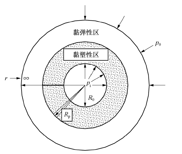 ②围岩为均质、各向同性岩体.同时将围岩看成不可压缩材料, 即黏塑性区内的体积应变为0, 且不考虑应变硬化与应变软化的影响;