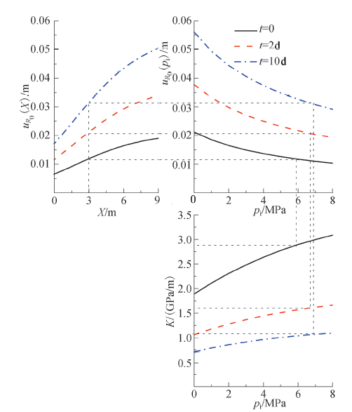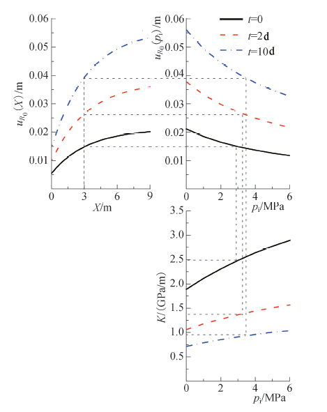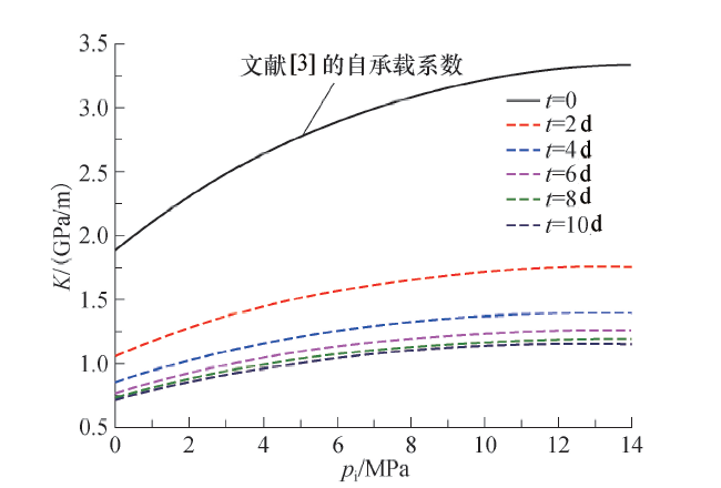 GRC曲线是动态的, 在某一时刻, 根据式(30)即可求出GRC曲线(ur-pi关系曲线).以X=3 m处为例, 由各个时间下的LDP曲线求出对应时间X=3 m处的隧道洞壁径向位移ur, 再根据GRC曲线得到隧道不同时刻的虚拟支护力pi, 最后由虚拟支护力pi即可求出X=3 m处不同时刻的围岩时变承载系数K(t).同理, 隧道开挖面后方不同距离的耦合类似.