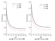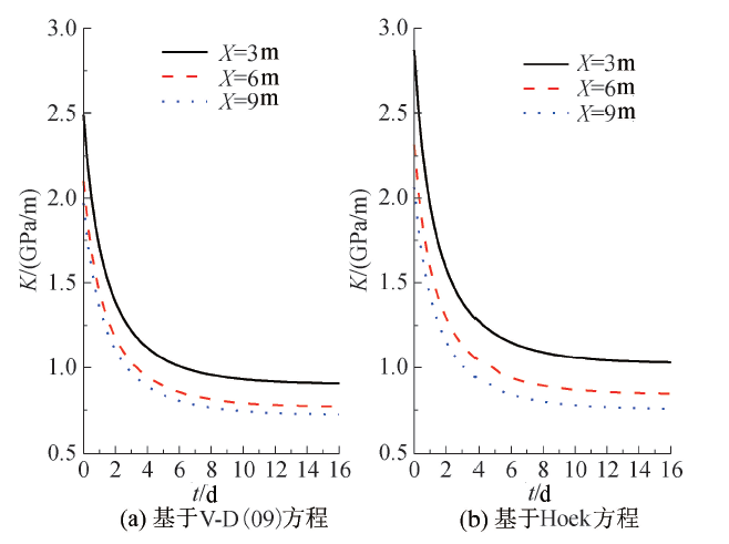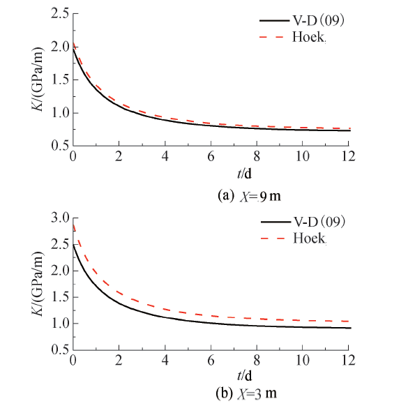 2)由图12可知, 开挖面后方同一断面处, 基于V-D(09)方程耦合得到的K(t)要比基于Hoek方程耦合得到的K(t)小, 而且这种差距随着X增大而减小.