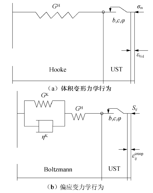 Boltzman-UST黏弹塑性模型(见图2)耦合了Boltzmann模型[25, 26]和塑性流动法则.此模型的重要假设是将材料的力学行为分为平均应力和偏应力2部分进行考虑[27, 28].即平均应力控制体积应变, 偏应力控制偏应变.图2中η K为开尔文动力黏度; GK为开尔文Hooke剪切模量; GH为Hooke剪切模量; c为黏聚力; φ 为内摩擦角;