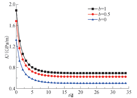 图3给出了在参数b影响下围岩时变承载系数K(t)随时间t的变化曲线.可见, 当参数b不变时, 围岩时变承载系数随着时间推移而减小, 且前2 d迅速降低, 围岩自承载能力骤降; 随后, 减小速度逐渐变缓; 最终曲线趋于平缓, 围岩时变承载系数趋于稳定值, 表明此时围岩自承能力已充分发挥.参数b取不同值时, 围岩时变承载系数随时间的变化趋势基本相似, 但是参数b取值越大, 同一时刻围岩时变承载系数越大, 这是因为参数b越大, 围岩塑性区半径越小, 围岩储能释放程度越低, 而使其自承载能力越高.