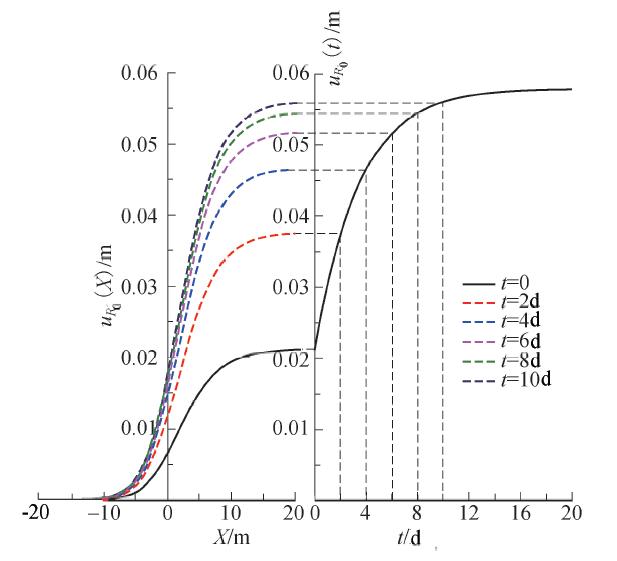3)两种LDP曲线的变化趋势类似, 基于V-D(09)方程的LDP曲线比基于Hoek的LDP曲线变化快, 而且2条曲线之间的差值随着X增大先变大后变小, 即这两种LDP曲线在开挖面处和距离开挖面足够远处契合度较好.由图8也可以看出, 随着时间推移, 洞壁位移逐渐增大, 但不是无止境的, 足够长时间后洞壁位移基本不再增加.