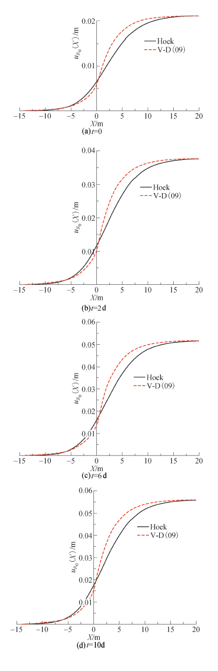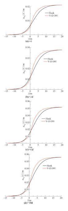 2)由图8可见, 开挖面前方及开挖面处, 不同时刻同一位置处, 基于V-D(09)方程计算的洞壁位移较基于Hoek方程计算的位移小; 但开挖面后方一小段距离以后, 基于V-D(09)方程计算得到的洞壁位移就开始比基于Hoek计算得到的位移大.