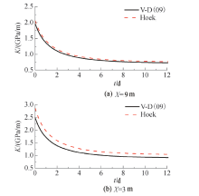 3)开挖面后方同一断面处, 基于V-D(09) 方程耦合得到的K(t)要比基于Hoek方程耦合得到的K(t)小, 而且这种差距随着X增大而减小.