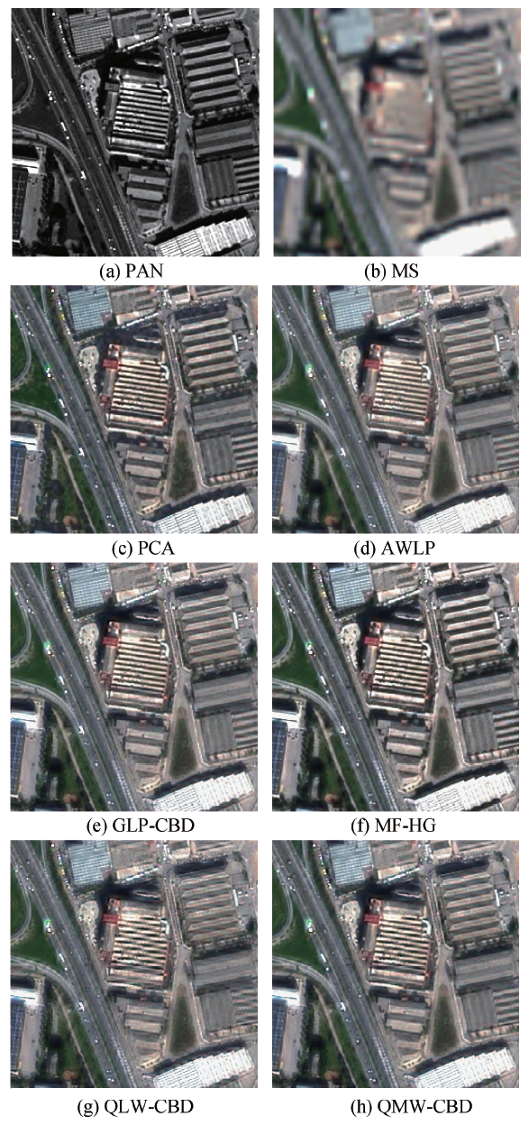 从图2中可以看到, PCA方法产生了较为明显的色彩失真, 而基于MRA的方法整体色彩与原始多光谱图像比较接近, 但在细节方面存在差异.例如, MF-HG的融合结果对比度较高, 边缘过增强, 而QLW-CBD的边缘有明显模糊的痕迹.相比较, QMW-CBD的细节部分好于QLW-CBD, 视觉结果较为接近GLP-CBD.但也存在一定差异, 如在建筑屋顶的纹理部分, GLP-CBD的纹理连续性更好, 这是由于GLP采用非采样拉普拉斯金字塔分解, 而QMW-CBD采用的是基于梅花形采样的提升变换, 从图3中可以看到, 其中PCA与MF-HG在细节增强方面比较突出, 特别是MF-HG产生的结果对比度高, 适合人眼观察, 但是PCA与MF-HG的光谱误差较高.这说明细节增强与光谱失真两者存在相互制约的关系.相比较, AWLP、GLP-CBD与QMW-CBD取得了良好的视觉效果, 同时在控制光谱失真方面比较出色.