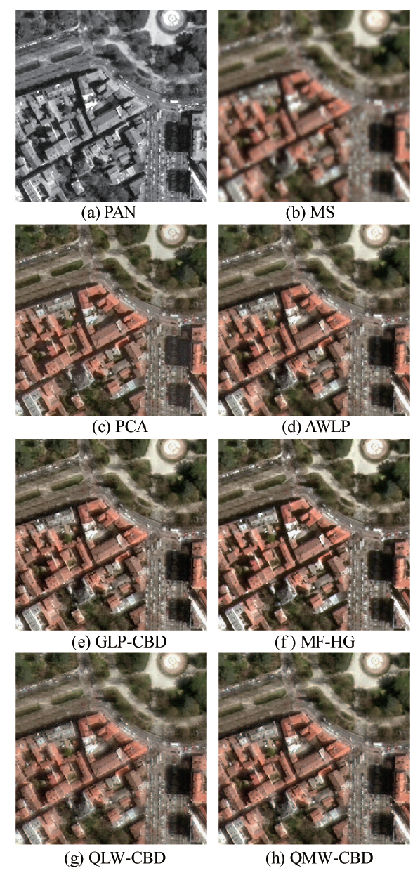 实验数据采用SPOT 6与Plé iades遥感卫星图像[17, 18].SPOT 6图像采集自西班牙巴塞罗那地区, 全色波段空间分辨率为1.5 m, 尺寸2048× 2048像系; 多光谱包含蓝/绿/红/近红外4个波段, 空间分辨率为6 m, 尺寸512× 512像素.Plé iades图像采集自法国图卢兹地区, 全色波段空间分辨率为0.8 m, 尺寸1024× 1024像素; 多光谱包含多光谱包含蓝/绿/红/近红外4个波段, 空间分辨率为3.2 m, 尺寸256× 256像素.