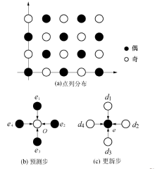 在梅花形采样阵下, 二维图像坐标被分为奇偶子列, 如图1(a)所示.因此提升结构式(6)和式(7)依然适用.基于提升结构的梅花形形态小波变换[15]利用局部残差最小化原则进行预测, 再利用局部像素值最大化进行更新, 结合图1(b)和图1(c), 其算法如下