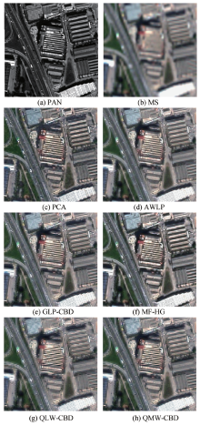 表1、表2分别列出了两组数据的实验结果, 其中理想值为理论最优值.划线数值为最优结果.可以看出, 在空间分辨率提升方面, PCA取得了最优结果, 反映在SCC数值最高.这是因为PCA直接将全色图像作为新的亮度通道, 因此SCC理论值等于1, 实验结果也证实了这一点.然而, PCA方法会造成较大的光谱误差.MF-HG的情况类似, 在空间提升方面比较出色, 这源自于半梯度算子能够有效提取图像边缘, 然而MF-HG方法也会造成较大的光谱失真.相比较, 其他方法在光谱失真方面控制较好, 特别是本文提出的算法QMW-CBD在ERGAS指标上达到最优, 而在SAM与Q4指标上取得最优或接近最优的结果.