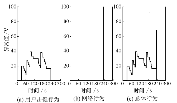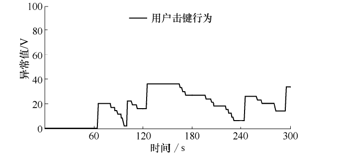 图4(a)表示用户W在总体实验中, 用户行为实验阶段的异常值变化曲线, 可以很明显看出用户行为模块异常值并未超过给定阈值(阈值设定为60), 即用户行为模块并未识别出用户W.图4(b)代表网络模块实验阶段的异常值变化曲线, 可以很明显的看出, 网络模块异常值已达到阈值(阈值为100), 即网络模块识别出用户W.