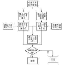 两个子模块分别实时采集用户行为信息和网络流量信息, 得到两个异常分值, 最后总体异常分值由两个子模块分值加权得到.其中, 两个子模块的权重(α , β )值在初始时都设为1, 在实时计算总体异常值时, 根据两个子模型的异常值, 动态调整权重.