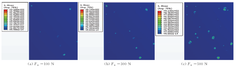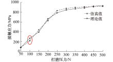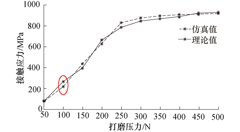 由图10知, 随着打磨压力的增大, 接触应力逐渐增大, 同时, 接触磨粒数目逐渐增多, 接触区域逐渐增大, 理论计算与仿真获得的接触应力曲线见图11.由图可知, 随着打磨压力的增大, 接触应力趋于稳定在800 MPa左右.在打磨压力