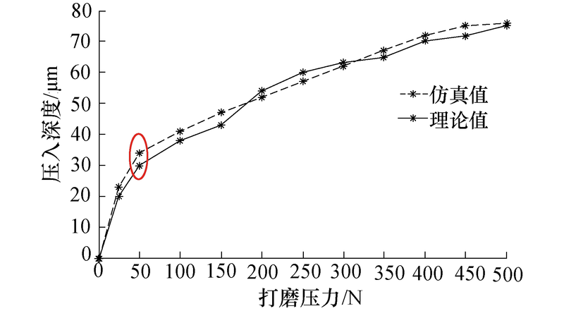 通过仿真求得磨粒最大压入深度与打磨压力的关系, 理论计算与仿真获得的压入深度变化曲线见图12, 可以看出, 随着打磨压力的增大, 压入深度趋于稳定在70 μ m左右.当