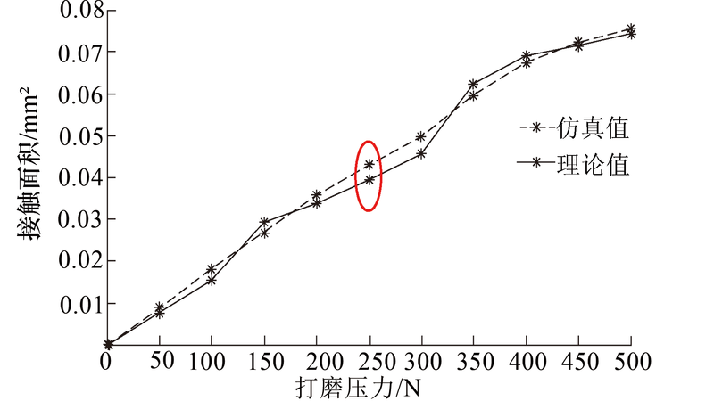 依据理论模型计算求得砂带表面磨粒与工件接触面积, 并通过仿真求得相应打磨压力下磨粒与工件之间的接触面积, 理论计算与仿真获得的接触面积变化曲线如图13所示.可以看出, 随着打磨压力的增大, 接触面积趋于稳定在0.65 mm2左右, 当打磨压力
