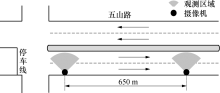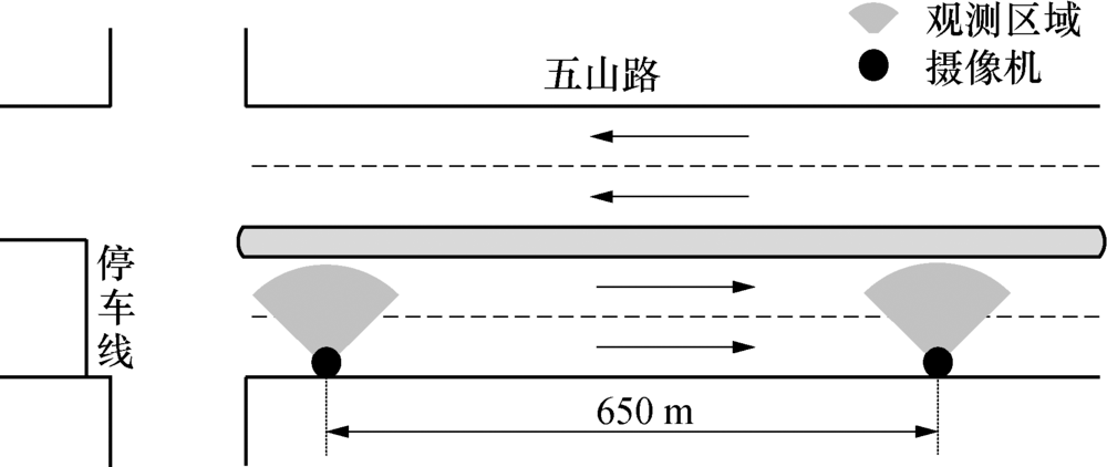 为证明行程车速分布假设的合理性和采用动态参数的必要性, 选取广州市五山路作为调查对象, 其情况如图1所示.该路段由双向4车道组成, 早晚高峰的公交车流较大, 包含了14条公交线路, 整个路段早晚高峰交通流呈现异质交通流特征.其中, 调查时间为上午7:30— 11:20.