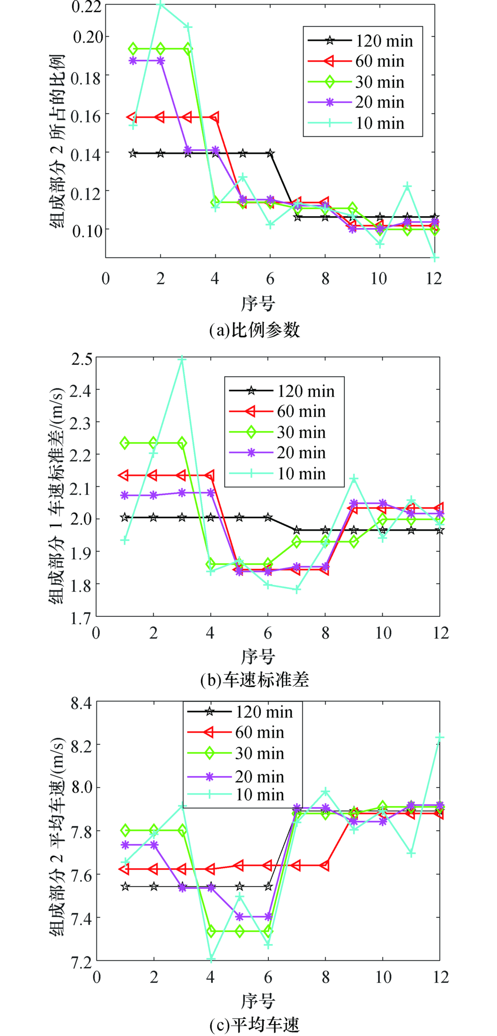 同时, 从图2和表2的决定系数R2 可知, 截断混合正态分布在不同时间区间粒度上的拟合效果均表现良好, 决定系数R2值均在0.97以上.这说明, 采用动态参数不影响分布模型拟合效果的稳定性, 即说明了可以在更小的时间区间粒度下估计混合分布的相关参数的可行性, 并据此推导动态车队离散模型.下面将具体分析不同时间区间粒度条件下截断混合正态分布相关参数的差别, 进一步说明采用动态参数的必要性.