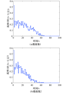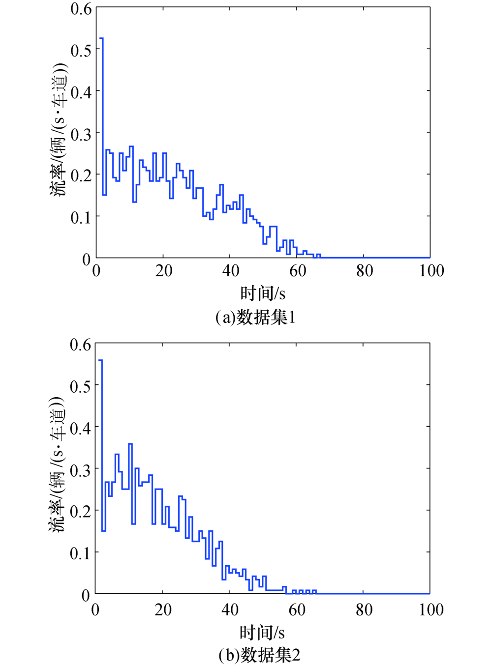 将本文第2节的调查数据, 按照时间区间划分为两个数据集(7:30— 9:30和9:30— 11:20), 按周期统计可获取两个数据集的上游交叉口离去流率分布和下游断面到达流率分布, 如图5和图6所示.