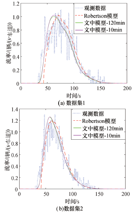 由图5可知, 2个数据集均呈现典型的交叉口离去流量分布特征:绿灯开始时, 离去流率最大, 为饱和流率值; 随后离去流率逐渐减少到0.由上面分析可知, 在车联网环境下, 很容易获取车辆在路段的行程速度信息, 基于此可对路段行程车速分布的参数进行动态估计.因此, 可根据上游交叉口离去流率分布和第3节中的模型, 计算获得下游断面的到达流率分布.为证明动态参数的有效性, 本案例中的参数估计时间区间粒度与本文第2节数据拟合的时间区间粒度一致, 即分为5个时段:120、60、30、20和10 min.基于此, 分别采用上述动态异质交通流车队离散模型和Robertson模型, 预测下游断面到达流率的分布情况.其中, Robertson模型中的相关参数可由文献[16]中的方法估计获得.为避免图线过多, 图6中仅绘制了实际到达流率曲线、Robertson模型预测曲线和文中模型2种时间区间粒度的预测到达流率分布曲线.