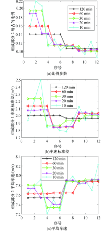 为证明模型采用动态参数的必要性和合理性, 根据上面对时间区间的分类, 对比分析了3个截断混合高斯分布的模型参数, 分别为组成部分2的所占比例、组成部分1的行程车速标准差和组成部分2的平均行程车速, 具体如图3所示.