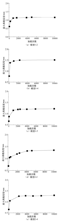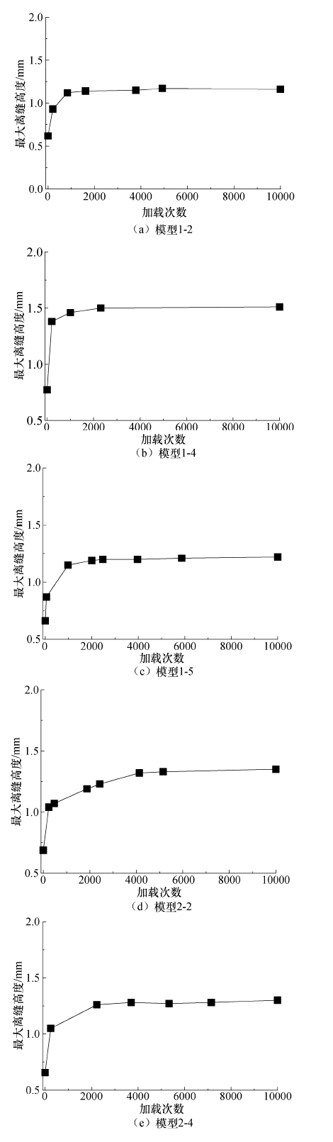 表1为不同的细粒含量、含水状态和加载方式的模型翻浆室内试验结果.图5为模型在位移加载过程中最大离缝高度随加载次数的变化规律.由图5可知, 在输入