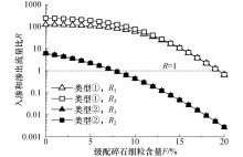 设置于基床表层底部的防渗排水层常见组成类型为“ 复合土工膜+中粗砂” 或“ 复合防排水板+中粗砂” [19].由图4可知, 级配碎石的渗透系数受其细粒含量影响显著, 而基床表层的$Q_{in}$ 、$Q_{(out, 1)}$ 和$Q_{(out, 2)}$ 又与级配碎石的渗透系数有关, 故图11给出了不同级配碎石细粒含量所对应的基床表层入渗与渗出流量之比$R_1$ 、$R_2$ (其中$R_1$=$Q_{in/Q_(out, 1)}$, $R_2$=$Q_{in}$/$Q_{(out, 2)}$, i=0.04, B=3000mm, H=5000mm, h=300mm).图中类型①为“ 复合土工膜+中粗砂” 的防渗排水层, 复合土工膜为隔水材料, 中粗砂为透水材料, 参照文献[20, 21]的经验值取中粗砂的厚度