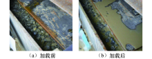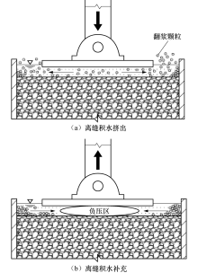 模型加载翻浆机理, 如图9所示, 针对填土饱和积水且与加载板存在离缝的模型, 由于离缝间充满积水, 加载时加载板与模型表面产生接触, 水受到离缝体积压缩而向板边挤出冲刷模型表面, 使表面颗粒受到渗透力作用而移动至加载板周围[14]; 卸载时加载板与模型表面分离, 离缝体积恢复, 模型饱和积水又回流至离缝内.在如此重复作用下, 加载时颗粒随离缝间积水横向冲刷而流失, 卸载时离缝间积水又不断得到补充, 导致翻浆现象产生.