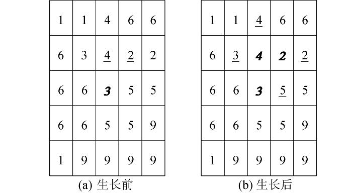 图像分析流程如图1所示.基于鱼眼镜头的卫星导航信号空间可用性分析本质上是一种图像分析方法, 即对图像中的可见天空区域进行检测和测量.邻域区域生长是一种重要的图像分割技术, 其思路是从一组生长点为起点, 将与该区域灰度值相似的像素点与生长点合并, 形成的新的区域作为新的生长点, 重复此过程直至完成整个图像的处理.以8-邻域区域生长算法为例, 如图2所示, 设置灰度值为3的像素点为生长点, 检查其周围8个邻域像素的灰度值, 将相近的灰度值所在像素点合并形成新的生长点, 然后重复该步骤直至完成所有像素点的生长.