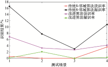 图12总结了传统8邻域算法和改进算法的识别结果, 由于改进算法对于树枝等遮挡较好的处理, 使得可见天空识别后的漏识率大大降低, 这是以牺牲误识率为代价. 误识率的高低同禁忌搜索区域设置的大小成正比, 本文所提的算法支持设置不同大小的禁忌搜索区域, 以满足不同等级的风险需求.图13为当选取更大的禁忌搜索区域时, 可见天空的损失情况, 对比可知算法误识率增高, 但漏识率随之下降.