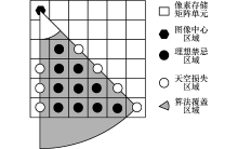 图5解释了禁忌区域设置的原理, 由于桶形畸变, 遮挡物从顶端到地面的剖面被分配到图5中灰色圆点所在的像素单元格, 而且越是远离图像中心, 遮挡被分配的像素单元格越多.因此, 想要识别该区域, 合理的方式为引入扇形禁忌区域, 离图像中心点越远, 则禁忌的区域越大.扇形禁忌区域的大小除受目标边界点位置影响, 还同所选取的圆心角角弧度有关.在所提出的算法中, 目标边界点由8-邻域区域生长算法决定, 而圆心角的角弧度, 即斜率