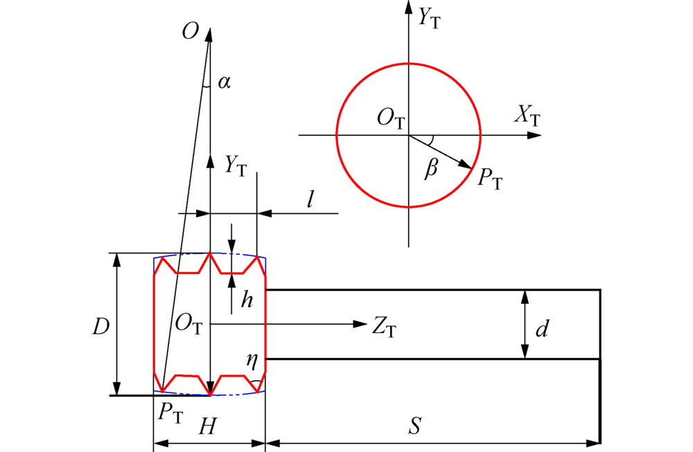 建立以鼓形刀头最大直径所在圆圆心OT为原点的刀具坐标系OT-XTYTZT, 平面OT-XTYT为鼓形刀头最大直径所在平面, ZT沿着刀轴方向, 平面OT-YTZT与刀具的截面线为刀具的母线, 鼓形圆弧母线的圆心O距离刀具端面的距离为H/2, 即鼓形刀头关于OT-XTYT平面对称.