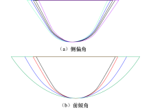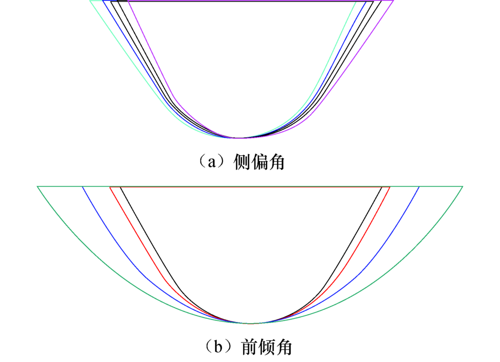 计算出刀位点坐标后, 需要进一步计算刀轴矢量.用多齿鼓形刀加工微结构的过程中, 由于刀轴矢量的变动会造成微结构形状尺寸发生变化, 图10为刀具在不同前倾角λ 和侧偏角θ 时侧铣微结构的截面形状, 前倾角和侧偏角的初始值分别为0° 和90° , 为减小这种精度损失, 刀轴矢量规划时应控制刀轴前倾角在(-1° , 1° )范围内调整, 侧偏角在(88.3° , 91.7° )范围内调整, 首先在每一刀位点处调整前倾角使多齿鼓形刀与叶片曲面更好地拟合, 接着再调整侧偏角调整3个沟槽槽深一致.