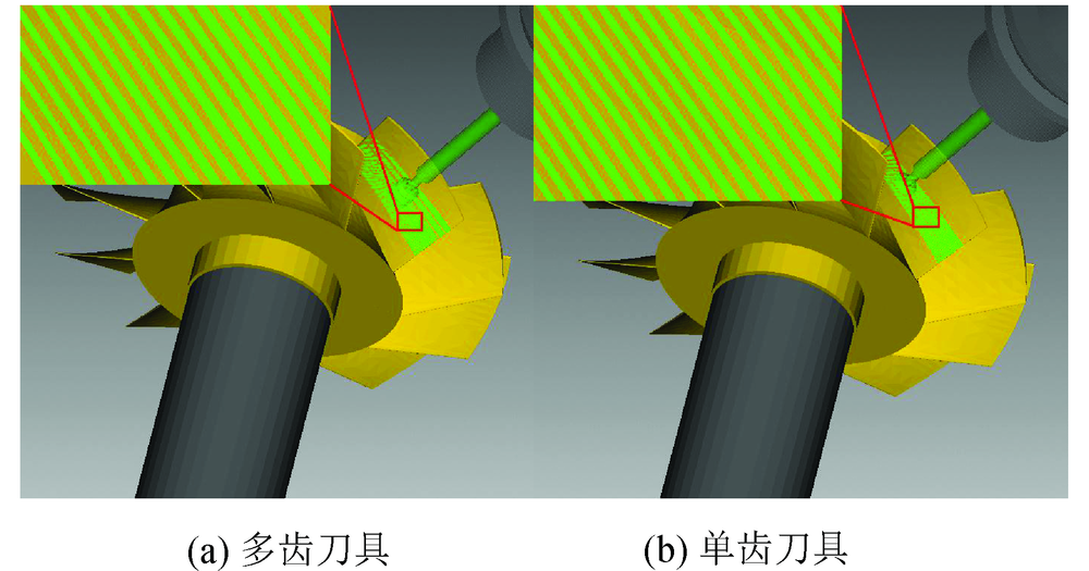分别利用多齿鼓形刀和单齿刀具, 对叶轮叶片上微结构的加工进行刀位轨迹规划, 为了使微结构顺着流体流动的方向分布, 应该尽量以叶片流场的方向为刀具进给方向, 即f方向沿着参数u方向, b方向则与参数v方向一致.用软件Vericut进行加工仿真的结果如图11所示, 其中图11(a)为多齿鼓形刀的微结构加工仿真效果, 图11(b)为单齿刀具的微结构加工仿真效果, 可以看出多齿鼓形刀完全可以替代单齿刀具进行微结构加工.